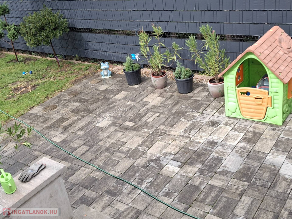 - 55 m2 elkerített hátsó kert nagyobb részt térkövel